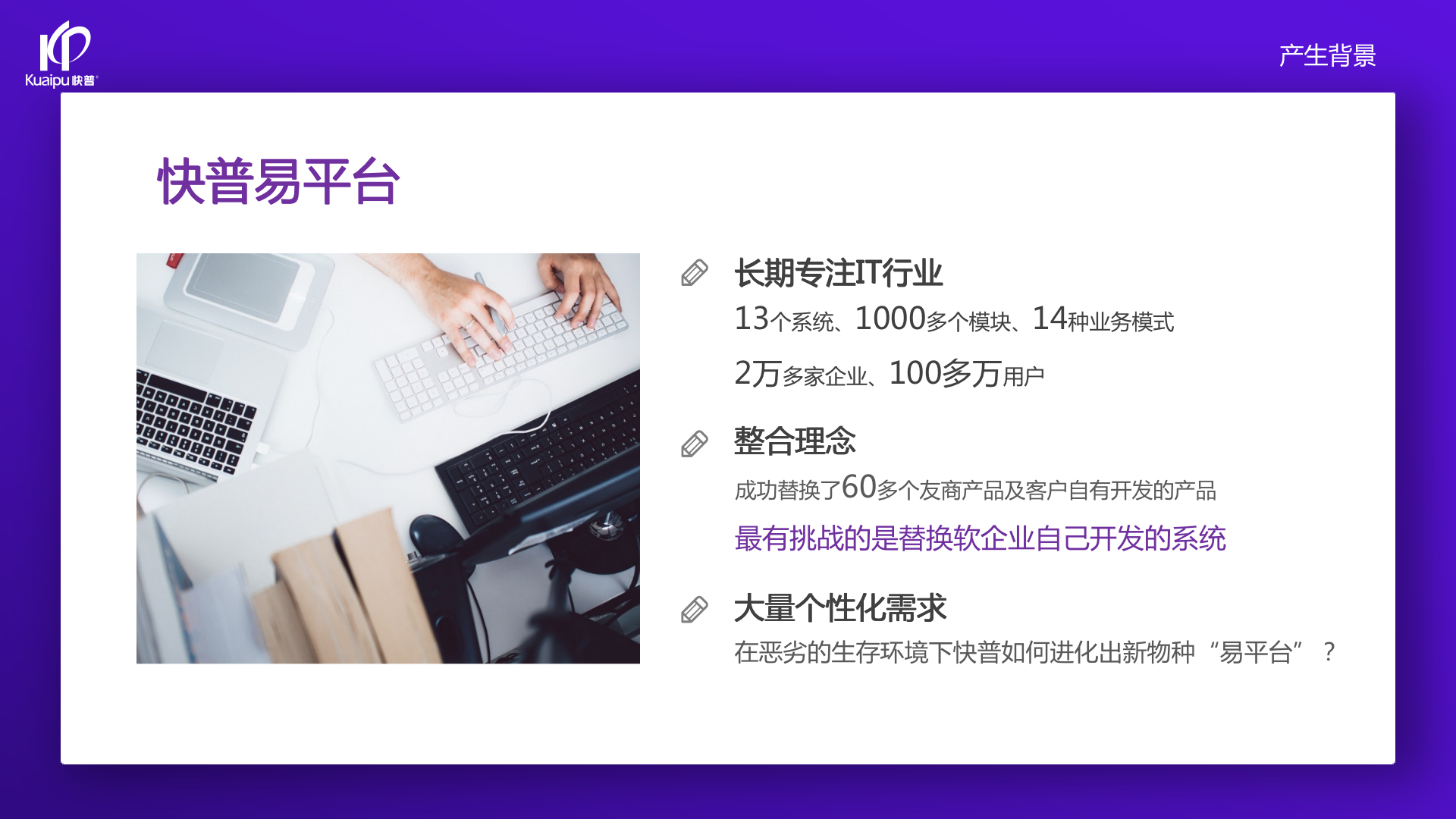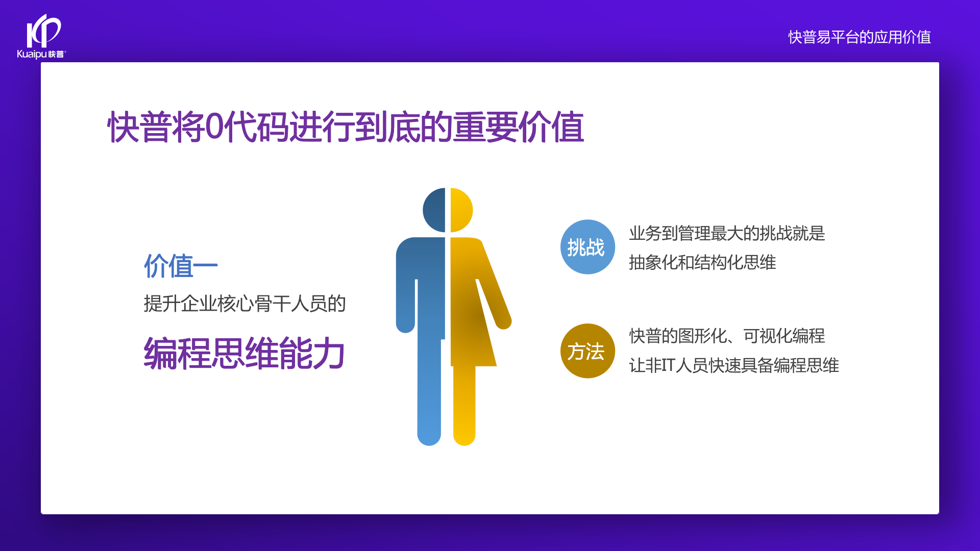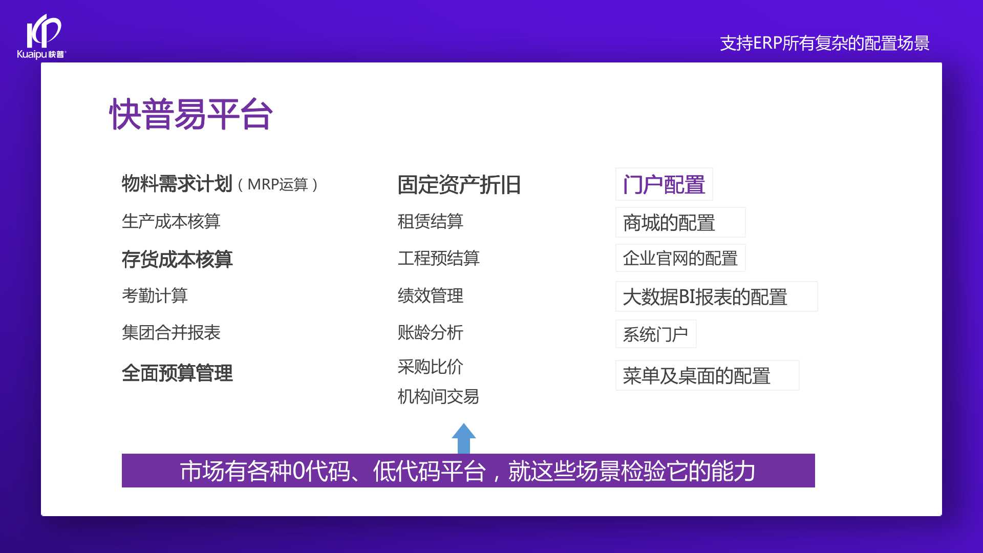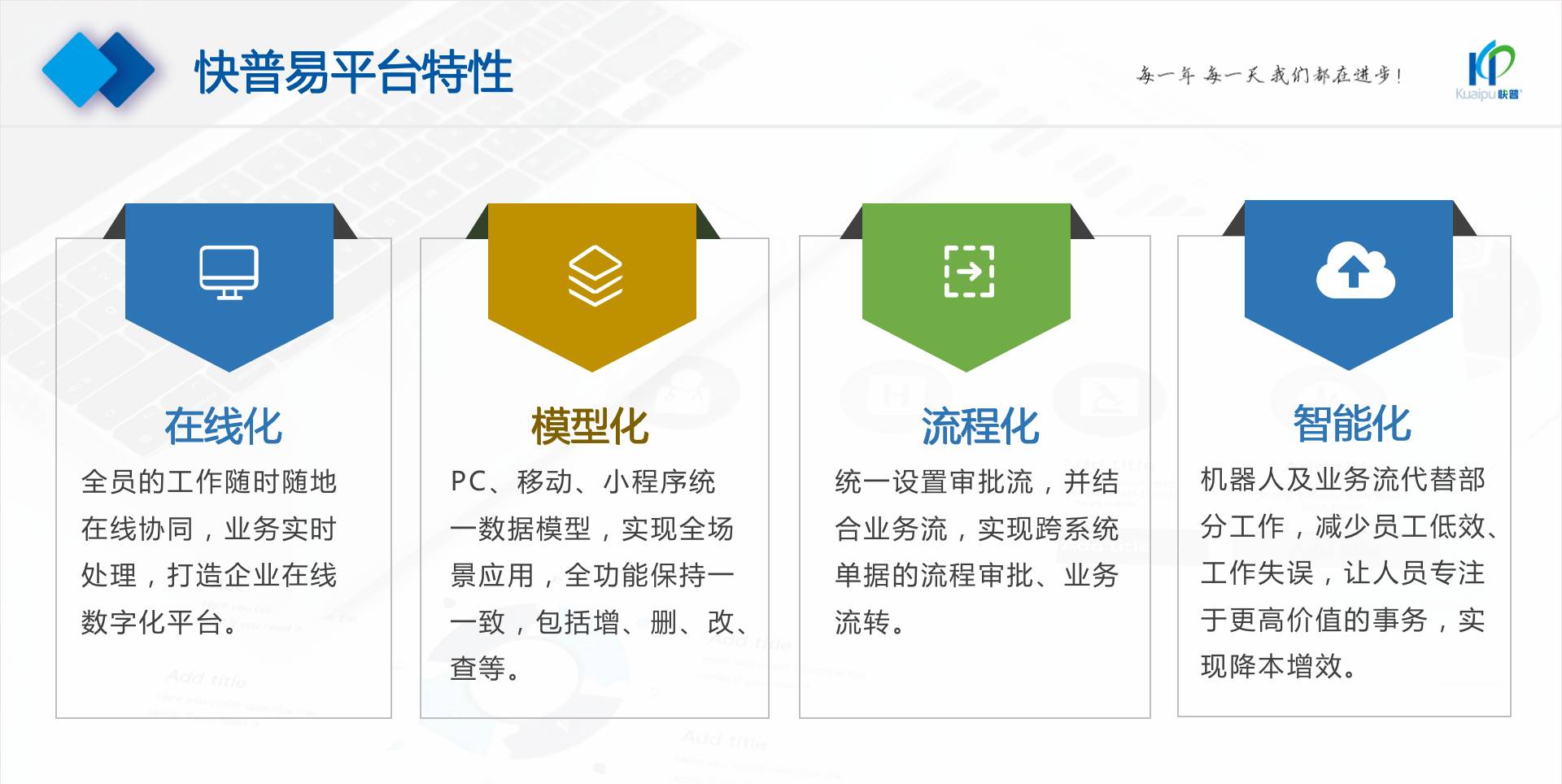 為了解決市場需求與平臺產(chǎn)品瓶頸等矛盾,實(shí)現(xiàn)徹底的零代碼平臺,快普堅(jiān)持理念創(chuàng)新,以理念推動平臺技術(shù)的創(chuàng)新。“以不變應(yīng)萬變”的理念:分析哪些東西未來肯定不變?哪些趨勢未來一定會變?從變化中找出不變的因素,從不變中找出變動的因素;從量變到質(zhì)變,經(jīng)歷萬變總結(jié)抽象出不變的本質(zhì)?;诳炱臻L期的信息化服務(wù)經(jīng)驗(yàn),開發(fā)配置出企業(yè)數(shù)字化轉(zhuǎn)型工具:快普易平臺成功解決了企業(yè)數(shù)字化轉(zhuǎn)型升級面臨的客戶大量個性化需求,真正實(shí)現(xiàn)隨需而變的設(shè)計(jì)理念,大大降低了信息化投入成本,提高信息化效率,幫助企業(yè)實(shí)現(xiàn)自主可控的技術(shù)創(chuàng)新,從而進(jìn)一步推動企業(yè)的業(yè)務(wù)創(chuàng)新和管理創(chuàng)新。