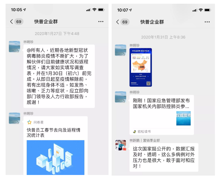 人力行政部快速啟動(dòng)“快普公司疫情防控工作”,通過問卷登記、每日健康知識(shí)宣導(dǎo)、每日疫情發(fā)布,復(fù)工基本物資準(zhǔn)備等一系列措施,全面關(guān)注員工動(dòng)向及健康狀況,著力建設(shè)“平安快普”!
