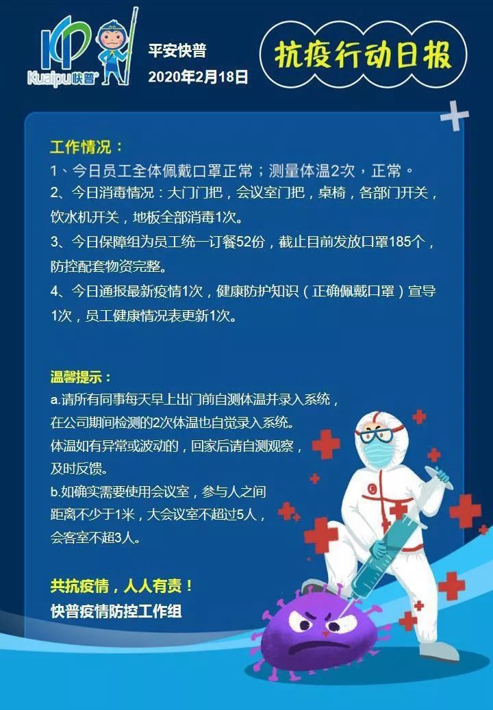 2月15日,公司正式成立“快普疫情防控工作組”,由各事業(yè)部報(bào)名推選的19位同事共同擔(dān)任。工作組從環(huán)境消毒、健康監(jiān)測、物資保障、防護(hù)知識(shí)宣導(dǎo)四方面全力抗疫,保障職場健康。