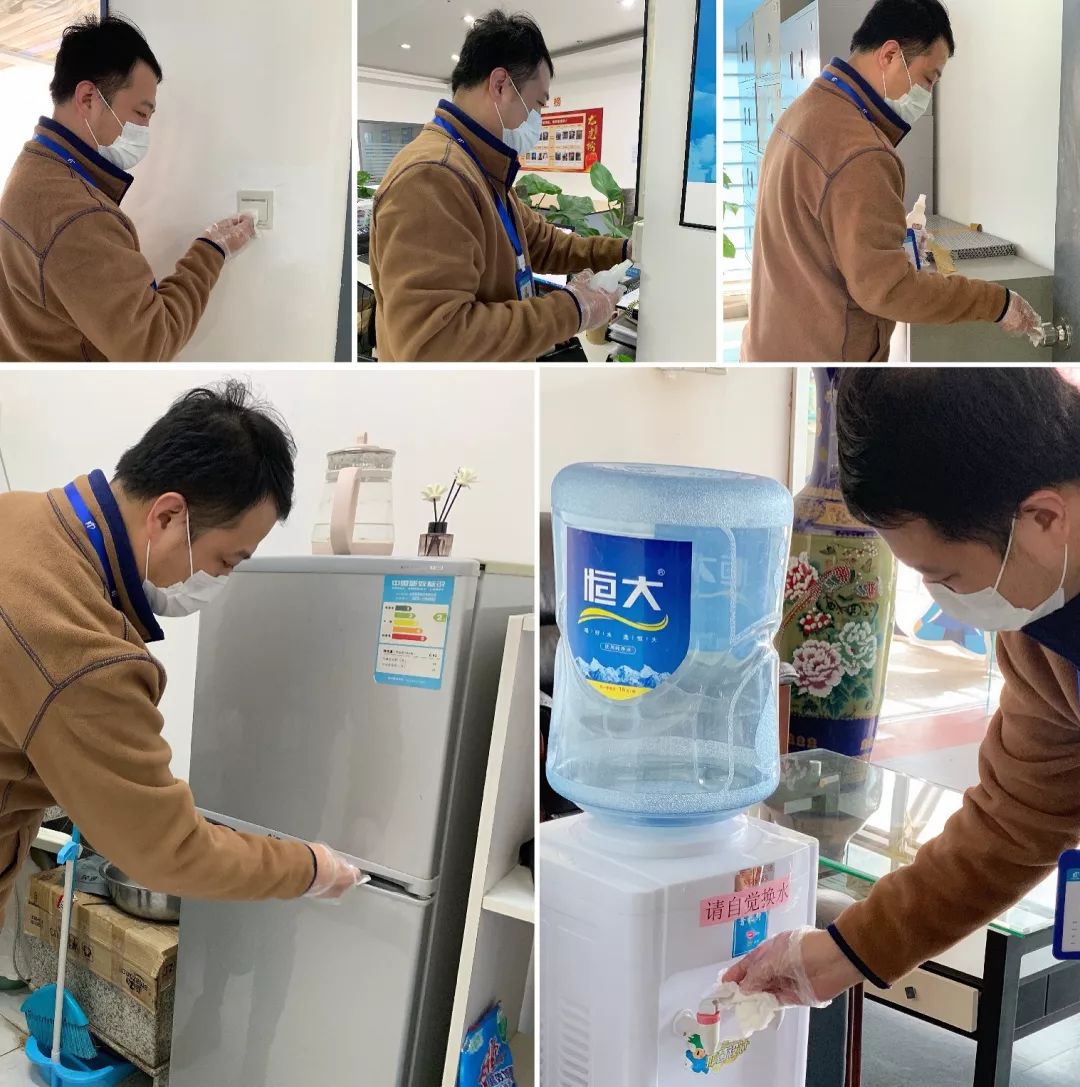 消毒小組嚴(yán)格實(shí)行每日消毒制度,對整體環(huán)境和局部區(qū)域進(jìn)行消毒,包括門把,桌椅,開關(guān),地板等。75%酒精噴灑 ,專用綿柔紙巾反復(fù)擦拭,全方位、無死角,確保為員工提供一個(gè)安全的辦公環(huán)境。