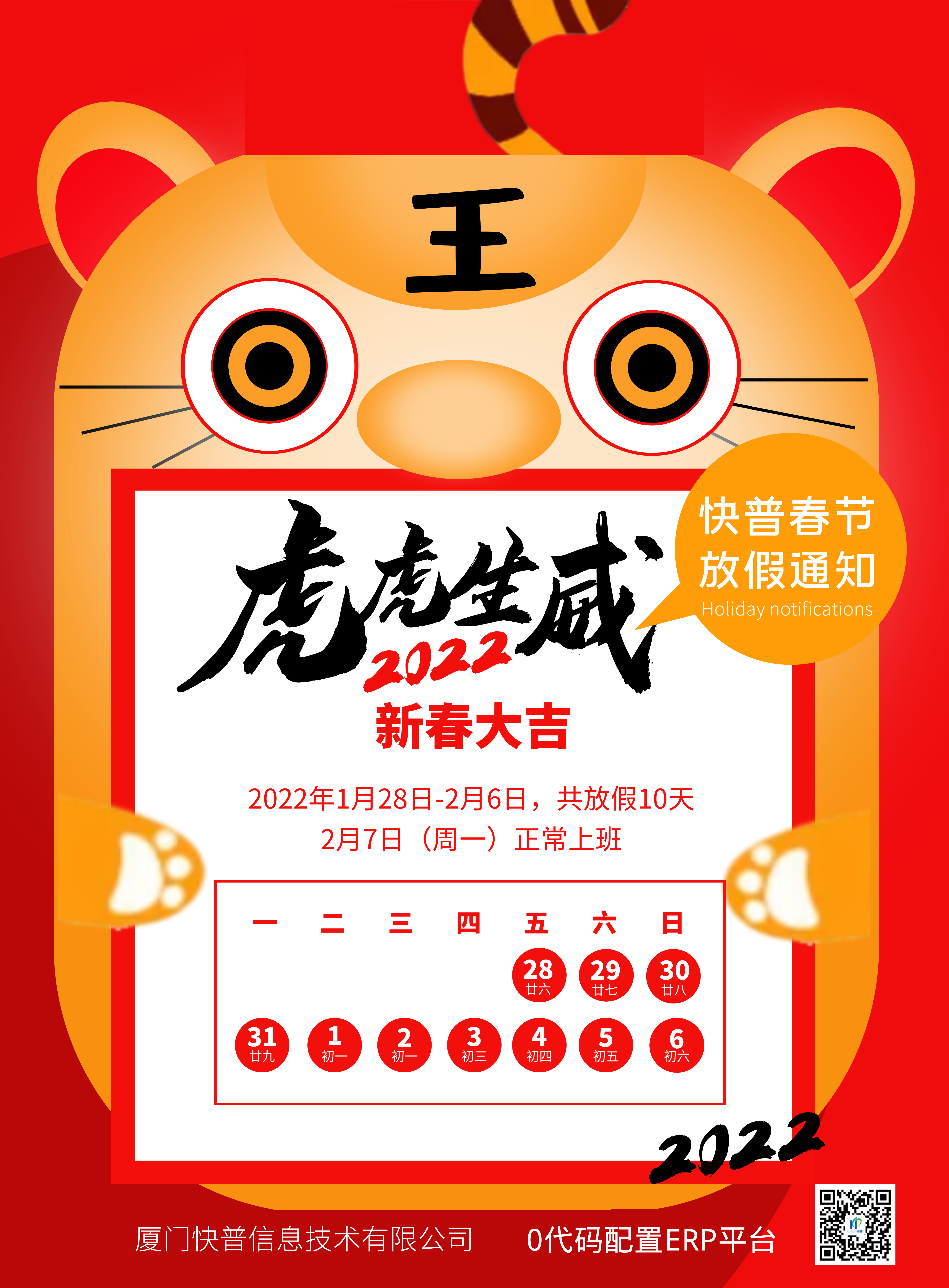 感謝大家一如既往的信任和厚愛,在此廈門快普信息技術(shù)有限公司攜全體員工向您致以節(jié)日的問候:祝您虎年大吉,生意興隆,闔家幸福!