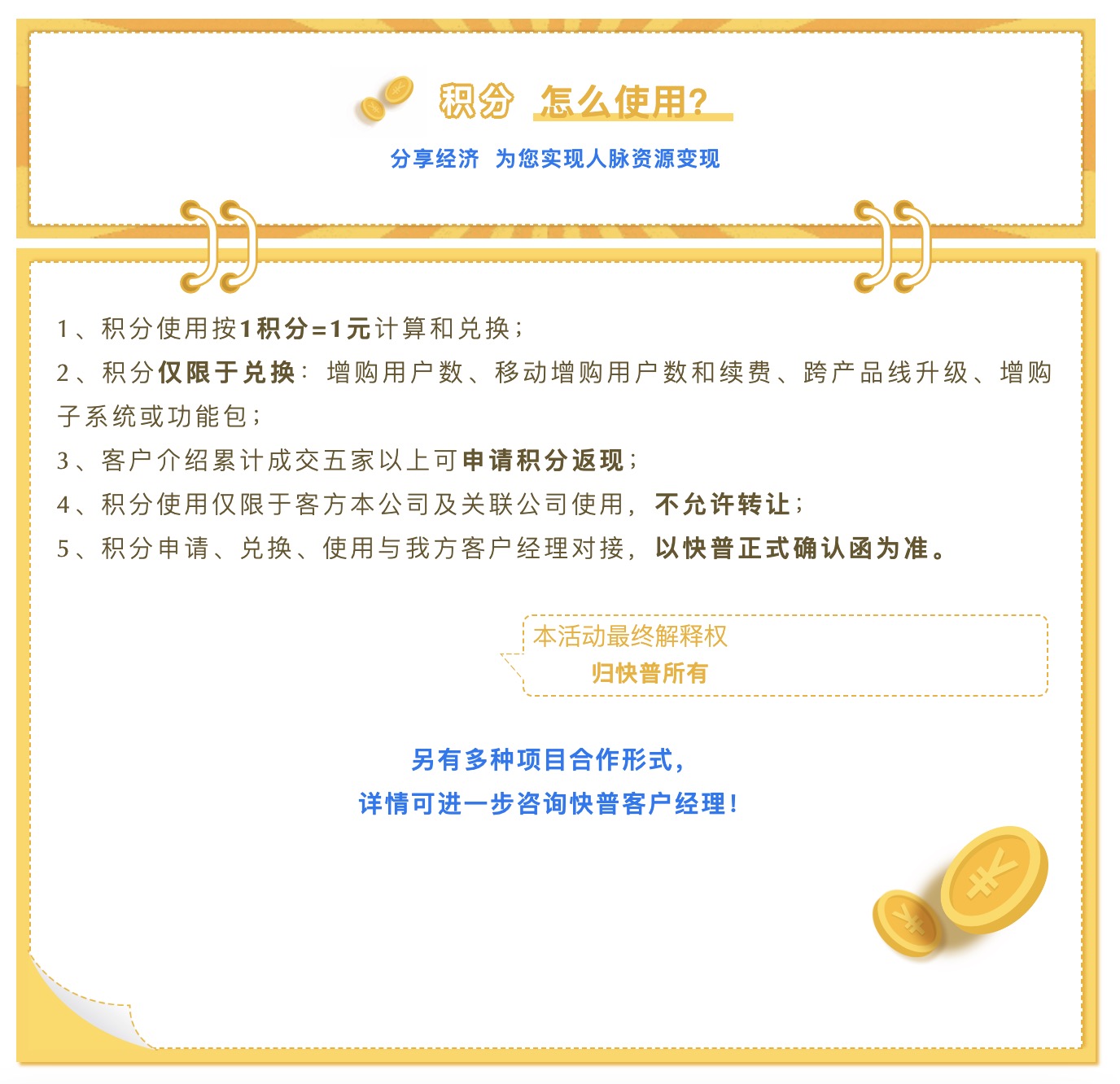 為進一步回饋老用戶的貢獻,現(xiàn)誠邀您參與“快普感恩回饋大行動!”,與我們共享數(shù)字經(jīng)濟發(fā)展的紅利!通過主動推薦、轉(zhuǎn)介紹客戶,您將獲取豐厚的積分返利,讓您的每一份付出都得到實質(zhì)性的回報,人脈資源也可以獲得變現(xiàn)!