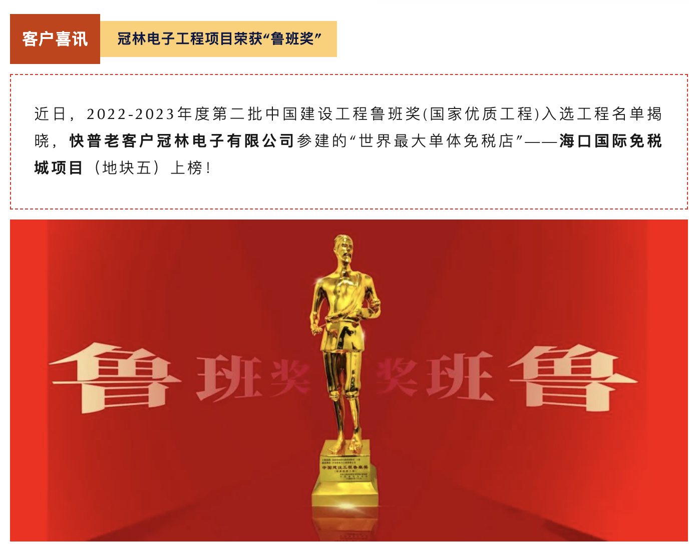 中國建設(shè)工程魯班獎(jiǎng)(國家優(yōu)質(zhì)工程)是由中華人民共和國住房和城鄉(xiāng)建設(shè)部指導(dǎo)、中國建筑業(yè)協(xié)會(huì)實(shí)施評選的獎(jiǎng)項(xiàng),是中國建筑行業(yè)工程質(zhì)量最高榮譽(yù)獎(jiǎng),被譽(yù)為中國建筑業(yè)的“奧斯卡”,主要授予中國境內(nèi)已經(jīng)建成并投入使用的各類新(擴(kuò))建工程,且工程質(zhì)量應(yīng)達(dá)到國內(nèi)領(lǐng)先水平。