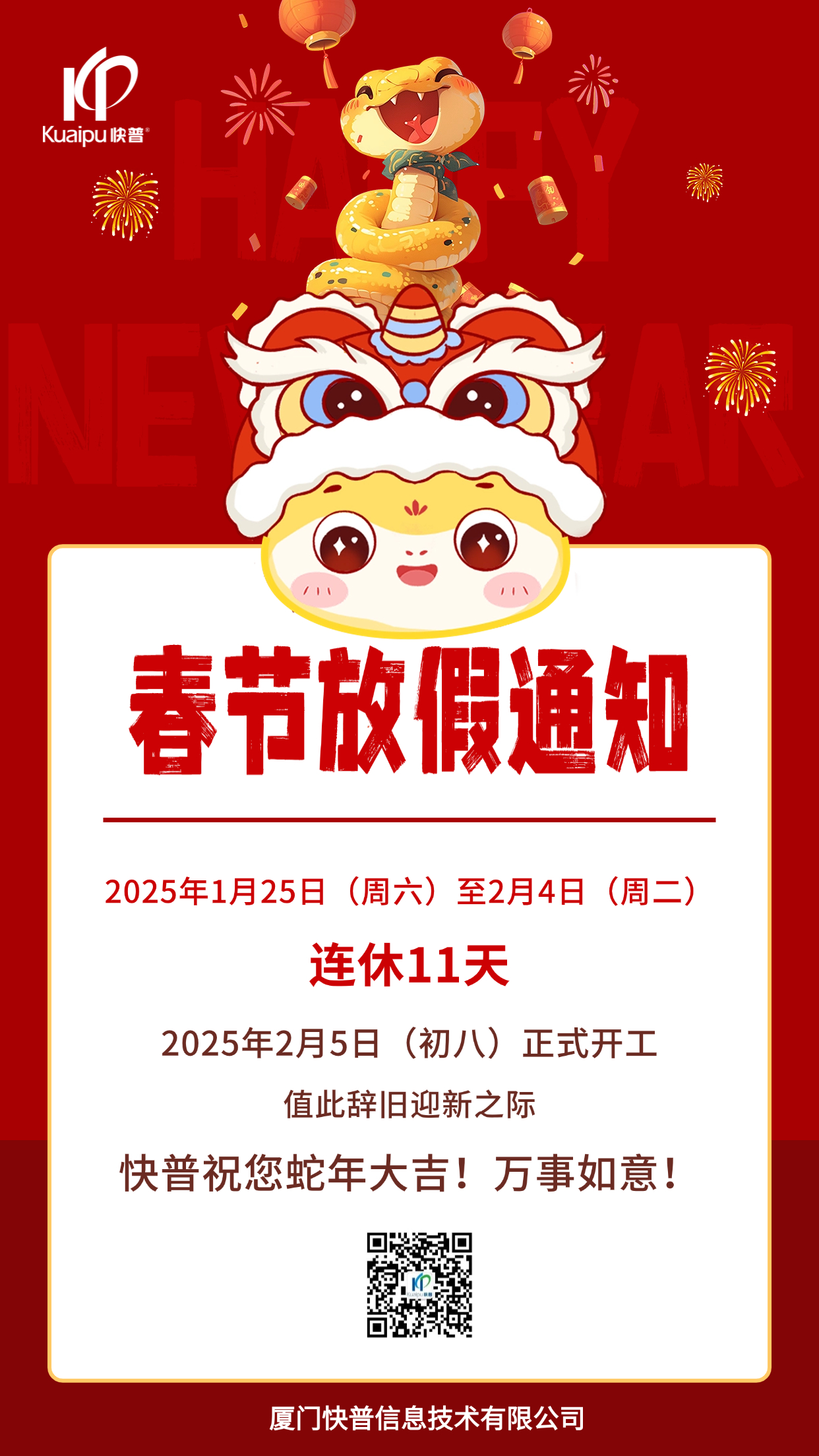 2025年春節(jié)即將到來,快普公司全體員工提前恭??炱沼脩粼谛碌囊荒昀?,生活美美滿滿,事業(yè)紅紅火火,財(cái)源滾滾而來,家庭和和美美,幸福永遠(yuǎn)常在。