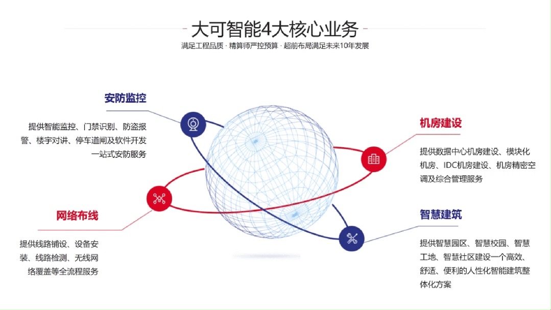江蘇大可智能工程有限公司(以下簡稱“江蘇大可”)成立于 2010 年,是一家領(lǐng)先的弱電智能化系統(tǒng)綜合方案提供商,專注智慧建筑整體解決方案設(shè)計與施工,以及大型企業(yè)弱電系統(tǒng)集成,包括安全防范系統(tǒng)、網(wǎng)絡(luò)綜合布線系統(tǒng)、核心機房工程、多媒體廣播系統(tǒng)、智能樓宇控制系統(tǒng)等,同時圍繞集成項目開展銷售和運維服務(wù)。
