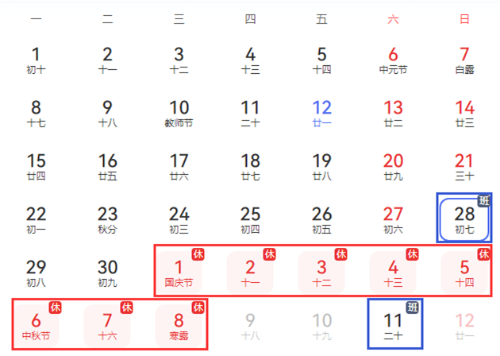 放假調(diào)休安排如圖所示: “藍(lán)色框”為補班時間、“紅色框”為放假時間