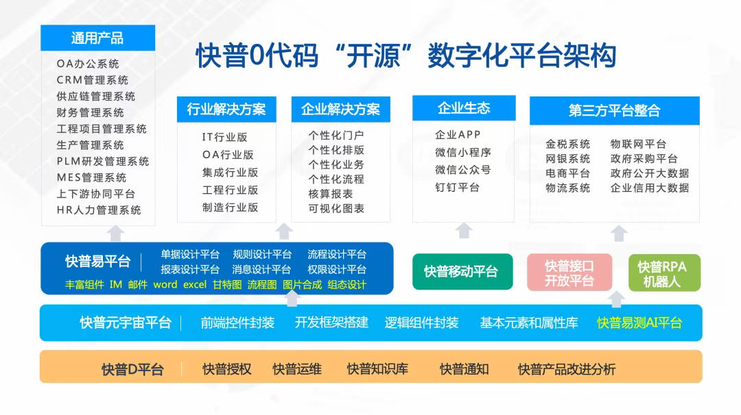 為此,快普依托自主研發(fā)的“快普易”整合管理平臺,以先進(jìn)的技術(shù)架構(gòu)為企業(yè)提供簡單、靈活的應(yīng)用體驗(yàn)。平臺具備零代碼配置、多系統(tǒng)無縫整合、AI深度嵌入等核心優(yōu)勢,為企業(yè)提供一條“小快輕準(zhǔn)”的數(shù)字化轉(zhuǎn)型路徑: